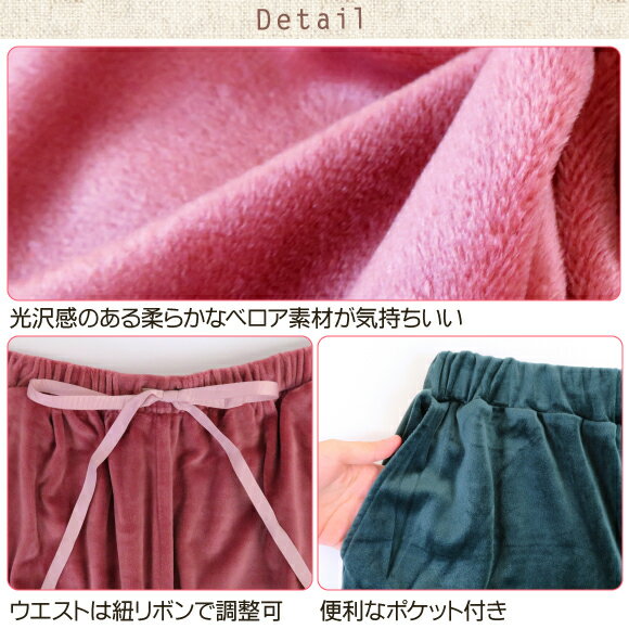 大人カジュアルなベロア素材パンツ! 着まわしやすいゆったりシルエット くすみカラーの定番カラバリが季節感◎ ベロア 単品 ワイドパンツ 無地 ルームウェア ウエストゴム ルームパンツ ベロアテーラード襟パジャマ ベロア刺繍ルームウェア なめらかなベロア素材でカジュアルすぎない単品ルームパンツ。