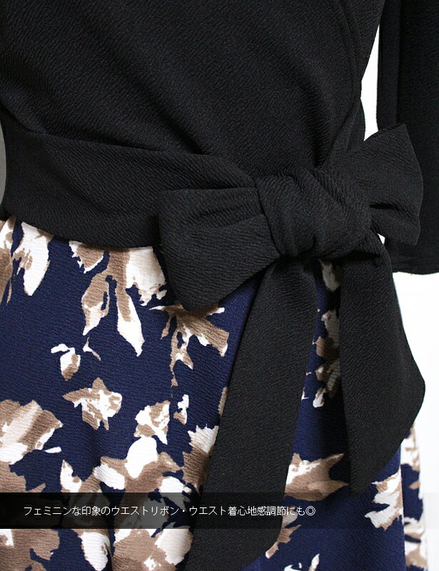 ■#eb01 kp0001-nv アデリーヌ ■クラッシュフラワー柄ネイビー F(S~M)/L/XL 大人の女性のためのお出かけフェミニンスタイル ウエストリボン/カシュクールワンピース コンビデザイン 同柄Check! 同素材Check! 同デザイン&異素材Check!